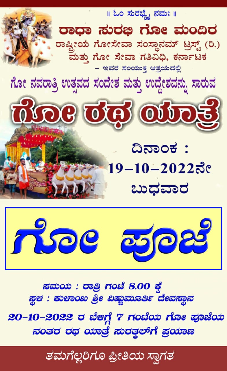ರಾಧಾ ಸುರಭಿ ಗೋ ಮಂದಿರ ರಾಷ್ಟ್ರೀಯ ಗೋಸೇವಾ ಸಂಸ್ಥಾನಮ್ ಟ್ರಸ್ಟ್ (ರಿ.)ಬೊಕ್ಕ ಗೋ ಸೇವಾ ಗತಿವಿಧಿದ ಮುತಾಲಿಕೆಡ್ ಗೋ ಉಚ್ಚಯದ ಸಂದೇಶ ಬೊಕ್ಕ ಉದ್ದೇಶಲೆನ್ ತೋಪಾವುನ ಗೋ ರಥ ಯಾತ್ರೆ ಅ.19 ಬುಧಾರ ದಾನಿ ನಡತ್ಂಡ್.