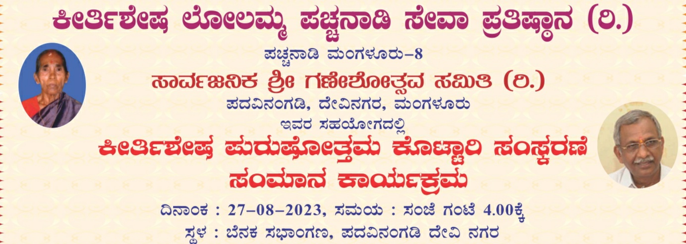 ಕುಡ್ಲ: ಕೀರ್ತಿಶೇಷ ಲೋಲಮ್ಮ ಪಚ್ಚನಾಡಿ ಸೇವಾ ಪ್ರತಿಷ್ಠಾನ (ರಿ.) ಬೊಕ್ಕ ಸಾರ್ವಜನಿಕ ಶ್ರೀ ಗಣೇಶೋತ್ಸವ ಸಮಿತಿ (ರಿ.) ಪದವಿನಂಗಡಿ ನೆತ್ತ ಒಟ್ಟುಸೇರಿಗೆಡ್ ಕೀರ್ತಿಶೇಷ ಪುರುಷೋತ್ತಮ ಕೊಟ್ಟಾರಿ ಸಂಸ್ಮರಣೆ, ಸನ್ಮಾನ ಲೇಸ್ ಆ.27 ಬಯ್ಯಗ್ 4 ಗಂಟೆಗ್ ಪದವಿನಂಗಡಿ ದೇವಿನಗರ ಬೆನಕ ಚಾವಡಿಡ್ ನಡಪರೆ ಉಂಡು.