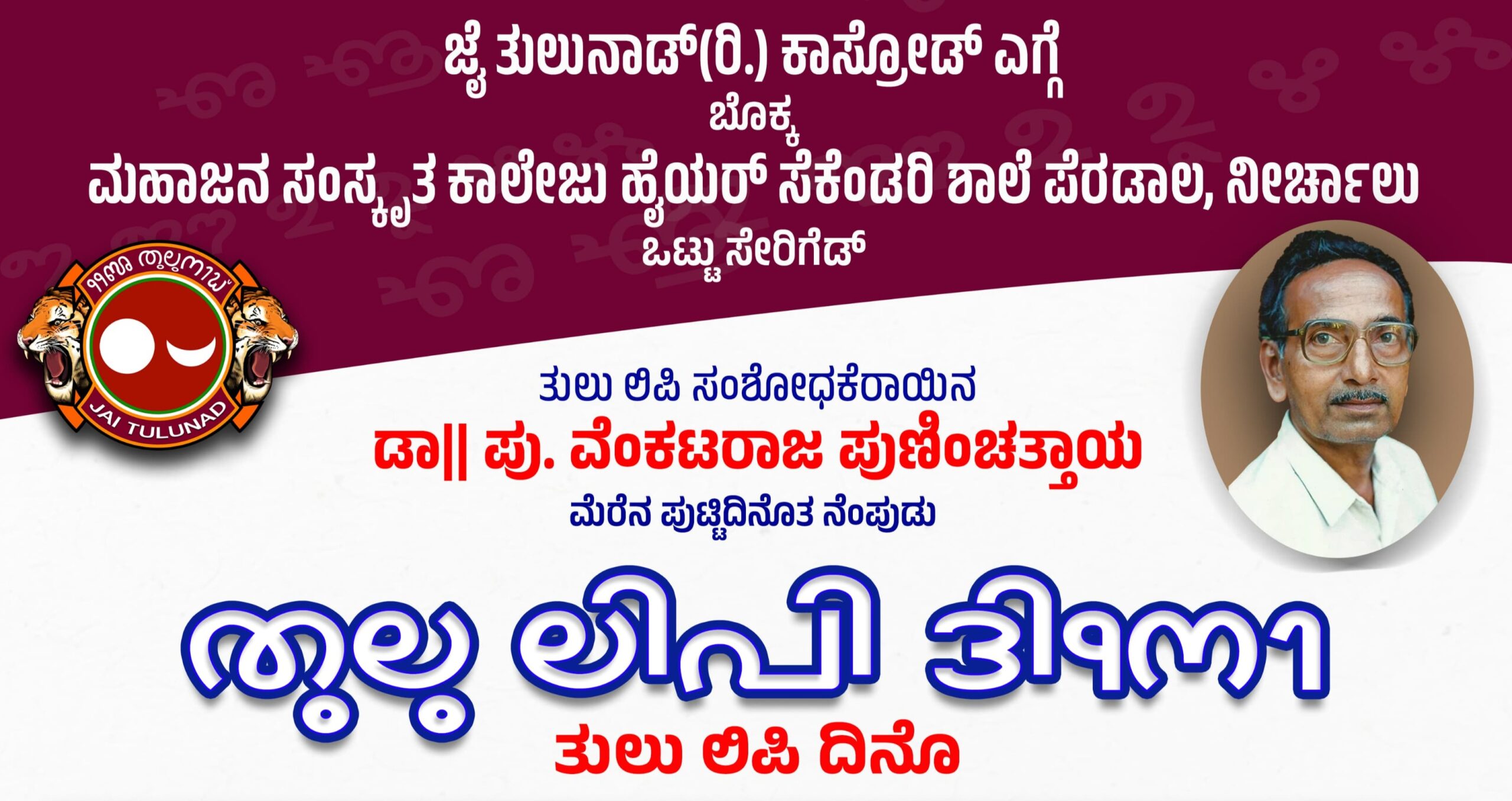 ಕಾಸ್ರೋಡು: ಜೈ ತುಲುನಾಡ್ (ರಿ.) ಕಾಸ್ರೋಡುದ ಮುತಾಲಿಕೆಡ್ ಬೊಕ್ಕ ಮಹಾಜನ ಸಂಸ್ಕೃತ ಕಾಲೇಜ್ ಹೈಯರ್ ಸೆಕೆಂಡರಿ ಶಾಲೆ ಪೆರಡಾಲದ ಒಟ್ಟುಸೇರಿಗೆಡ್ ಅ.10 ಕ್ಕ್ ಮಹಾಜನ ಸಂಸ್ಕೃತ ಕಾಲೇಜ್ ಹೈಯರ್ ಸೆಕೆಂಡರಿ ಶಾಲೆ ಪೆರಡಾಲ, ನೀರ್ಚಾಲುಡ್ ತುಲು ಲಿಪಿ ಸಂಶೋಧಕೆರ್ ಡಾ.ಪು. ವೆಂಕಟರಾಜ ಪುಣಿಂಚತ್ತಾಯ ಮೆರೆನ ಪುಟ್ಟುದಿನತ್ತ ನೆಂಪುಗಾದ್ ತುಲು ಲಿಪಿ ದಿನೊ ಲೇಸ್ ನಡಪರೆ ಉಂಡು.