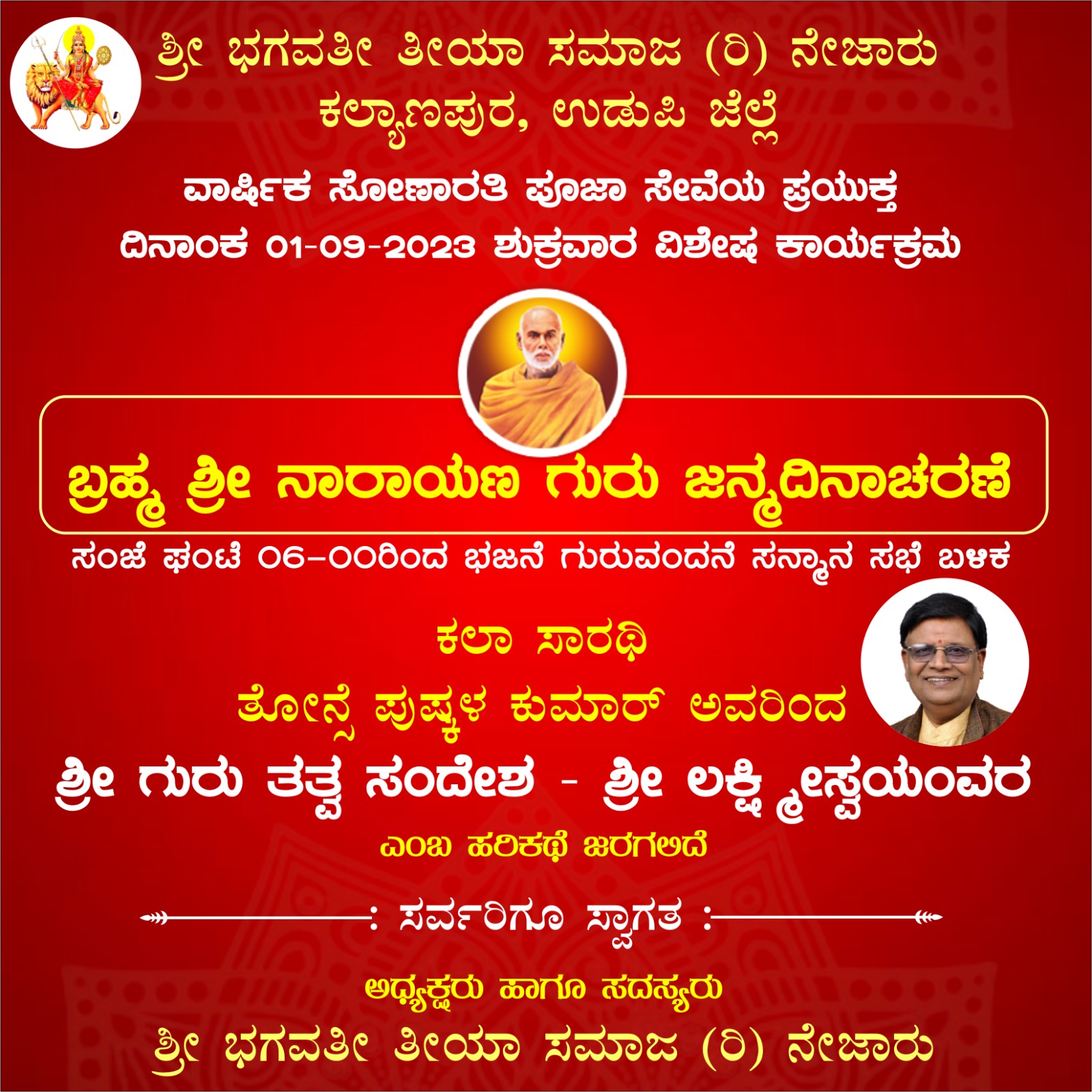 ಒಡಿಪು: ಕಲ್ಯಾಣಪುರದ ನೇಜಾರ್ ಶ್ರೀ ಭಗವತೀ ತೀಯಾ ಸಮಾಜ (ರಿ.) ದ ಮುತಾಲಿಕೆಡ್ ಬ್ರಹ್ಮಶ್ರೀ ನಾರಾಯಣ ಗುರು ಜನ್ಮದಿನಾಚರಣೆ ಸೆ.1 ಸುಕ್ರಾರ ನಡಪರೆ ಉಂಡು.…