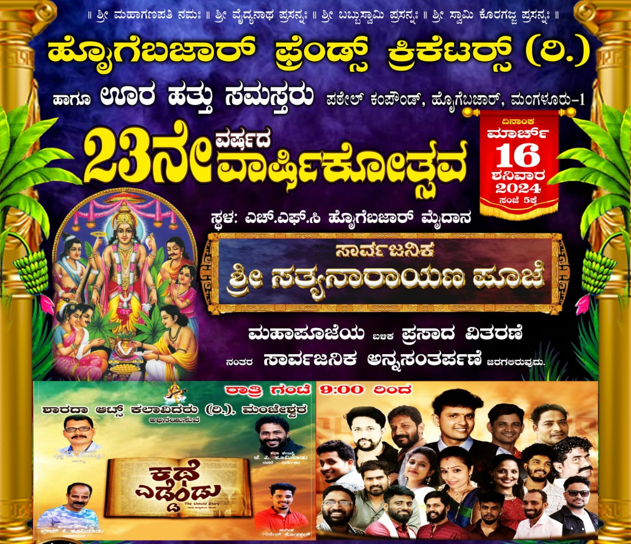 ಕುಡ್ಲದ ಹೊೖಗೆಬಜಾರ್ ಫ್ರೆಂಡ್ಸ್ ಕ್ರಿಕೆಟರ್ಸ್ (ರಿ.) ದ 23ನೇ ವಾರ್ಷಿಕ ಉಚ್ಚಯದ ಲೆಕ್ಕೊಡು ಮಾ.16 ಸನಿಯಾರ ಸಾರ್ವಜನಿಕ ಶ್ರೀ ಸತ್ಯನಾರಾಯಣ ಪೂಜೆ ಬೊಕ್ಕ “ಕಥೆ…