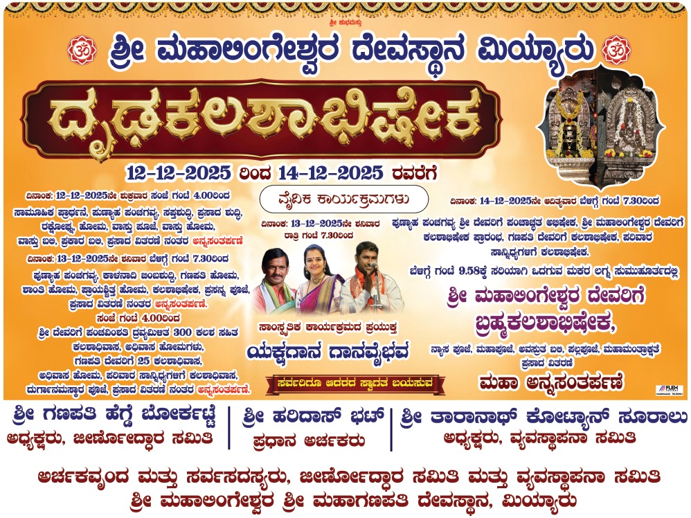 ಮಿಯ್ಯಾರು ಶ್ರೀ ಮಹಾಲಿಂಗೇಶ್ವರ ದೇವಲ್ಯಡ್ ದೃಢಕಲಶಾಭಿಷೇಕ ಡಿಸೆಂಬರ್ 12-14 ತಾರೀಕ್ ಮುಟ್ಟ ನಡಪರೆ ಉಂಡು. ಡಿ.13 ಕಾಂಡೆ ಬಿಂಬ ಶುದ್ಧಿ, ಗಣ ಹೋಮ, ಕಲಶಾಭಿಷೇಕ,…